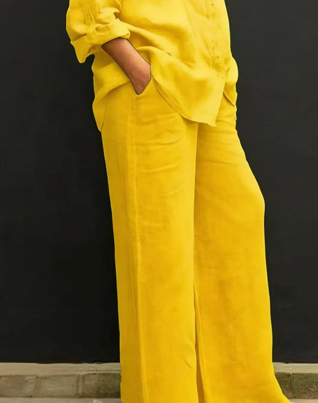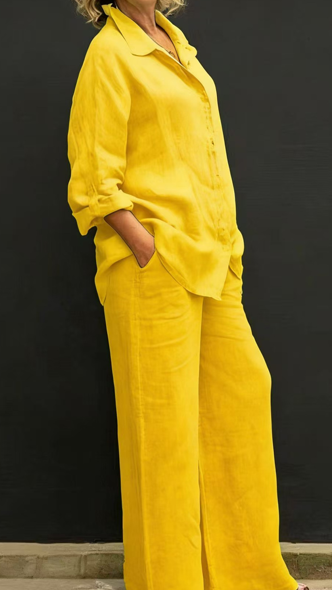 This set stands out with its sleek collared shirt cut, matching wide-leg trousers, and vibrant solid yellow hue. Crafted from breathable, skin-friendly cotton-linen fabric, it maintains an authentic texture, dry finish, and natural drape. The bright color paired with the relaxed fit creates an easygoing vacation vibe. It not only flatters all body types beautifully but also strikes the ideal balance between style and comfort. Whether you're heading out for a weekend stroll, meeting friends, or embarking on a short getaway, this set lets you create a chic, casual look with minimal effort.
