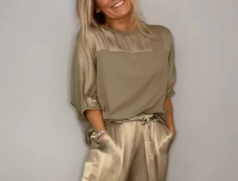 Slip into effortless elegance with this silky two-piece set featuring a relaxed-fit top and high-waisted pants. The soft sheen of the fabric adds a luxurious touch, while the adjustable waist tie and oversized pockets deliver comfort and practicality.