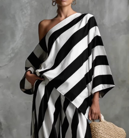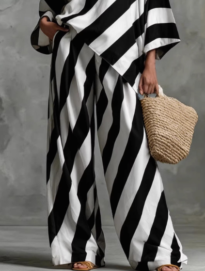 The diagonally striped wide-leg pants, echoing the top, visually lengthen the legs, while the loose fit perfectly conceals issues like wide hips, thick thighs, and crooked legs. The high waist and draping fabric further enhance the effect.